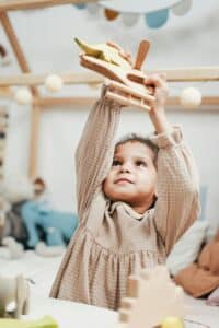 Provide open-ended toys: Toys with built-in lights and sounds are fun to buy but hamper creativity. Open-ended toys like blocks, pretend food and dishes, and dress-up clothes can be used whichever way the child chooses. Additionally, children can use all sorts of “recycled” materials, like empty yogurt containers or toilet paper rolls, string, or rubber bands to further imaginative play.